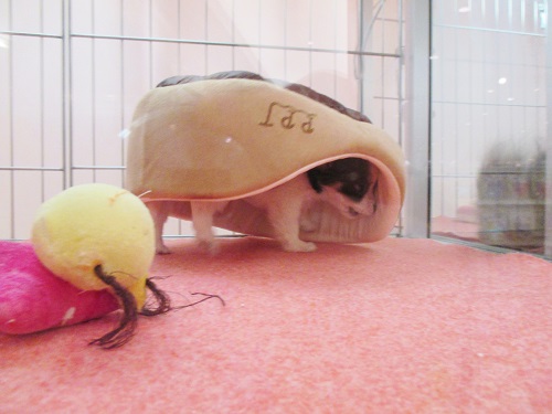 ベッドに隠れておもちゃでハムハム(*´ω`*)