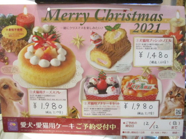 ワンちゃんネコちゃん用のクリスマスケーキの予約受付中です