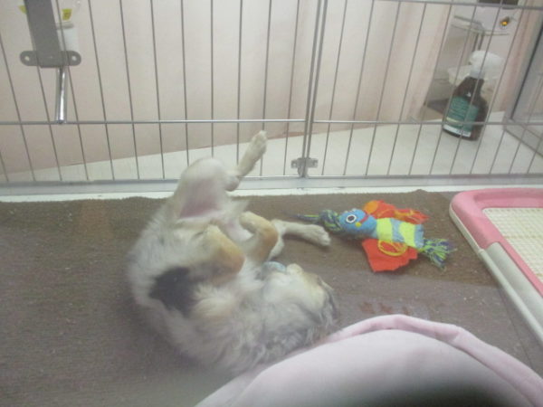 ゴローンと寝転んでおもちゃと遊ぶチワ君