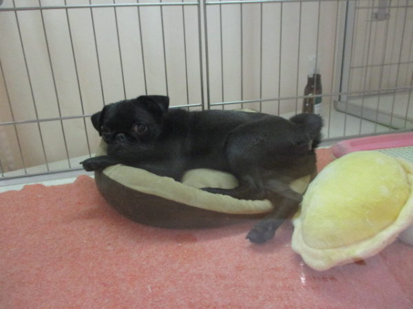 お隣のパグちゃんはベッドでゆったり