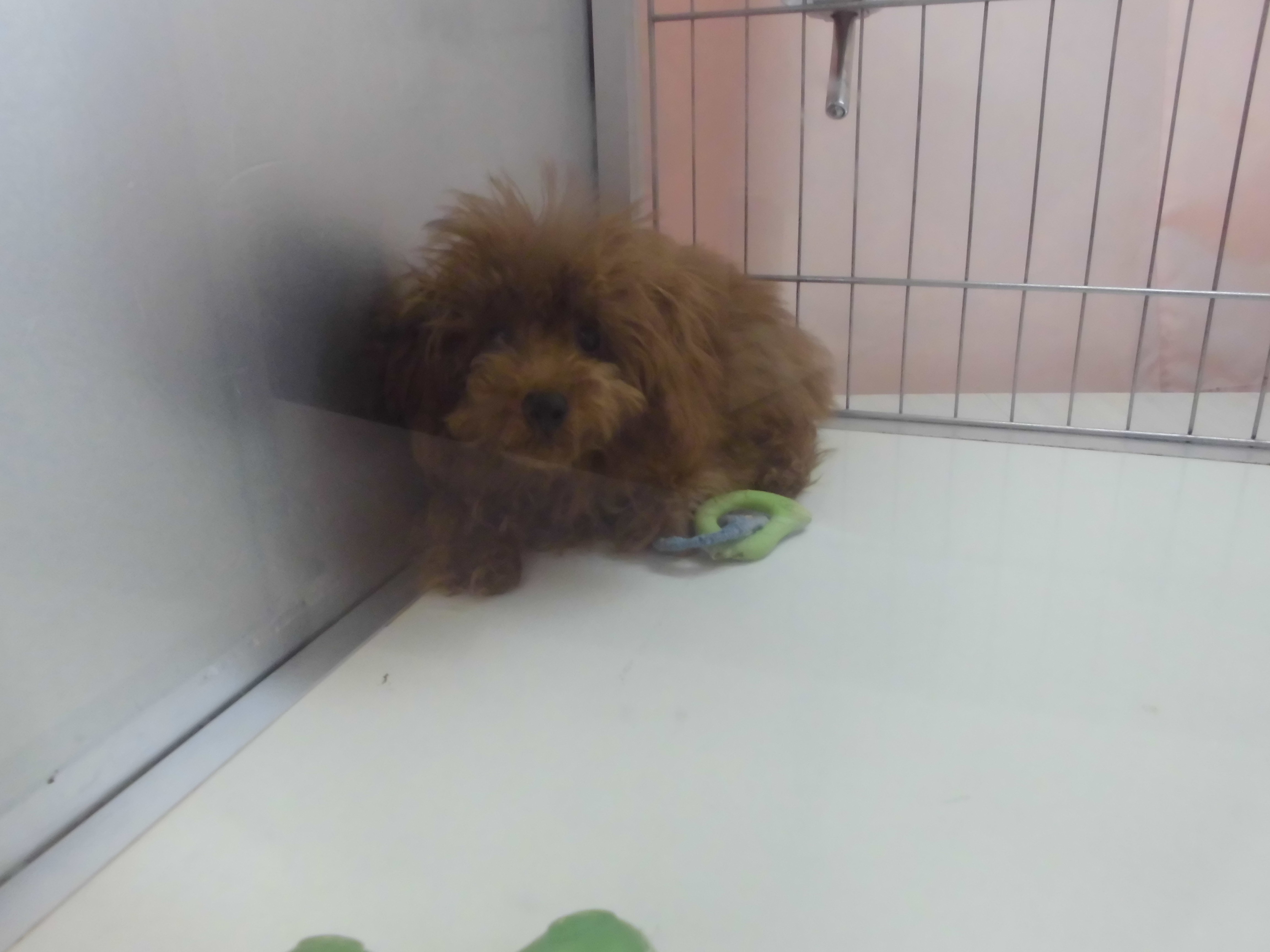 ブースの隅でおもちゃをカミカミしていた