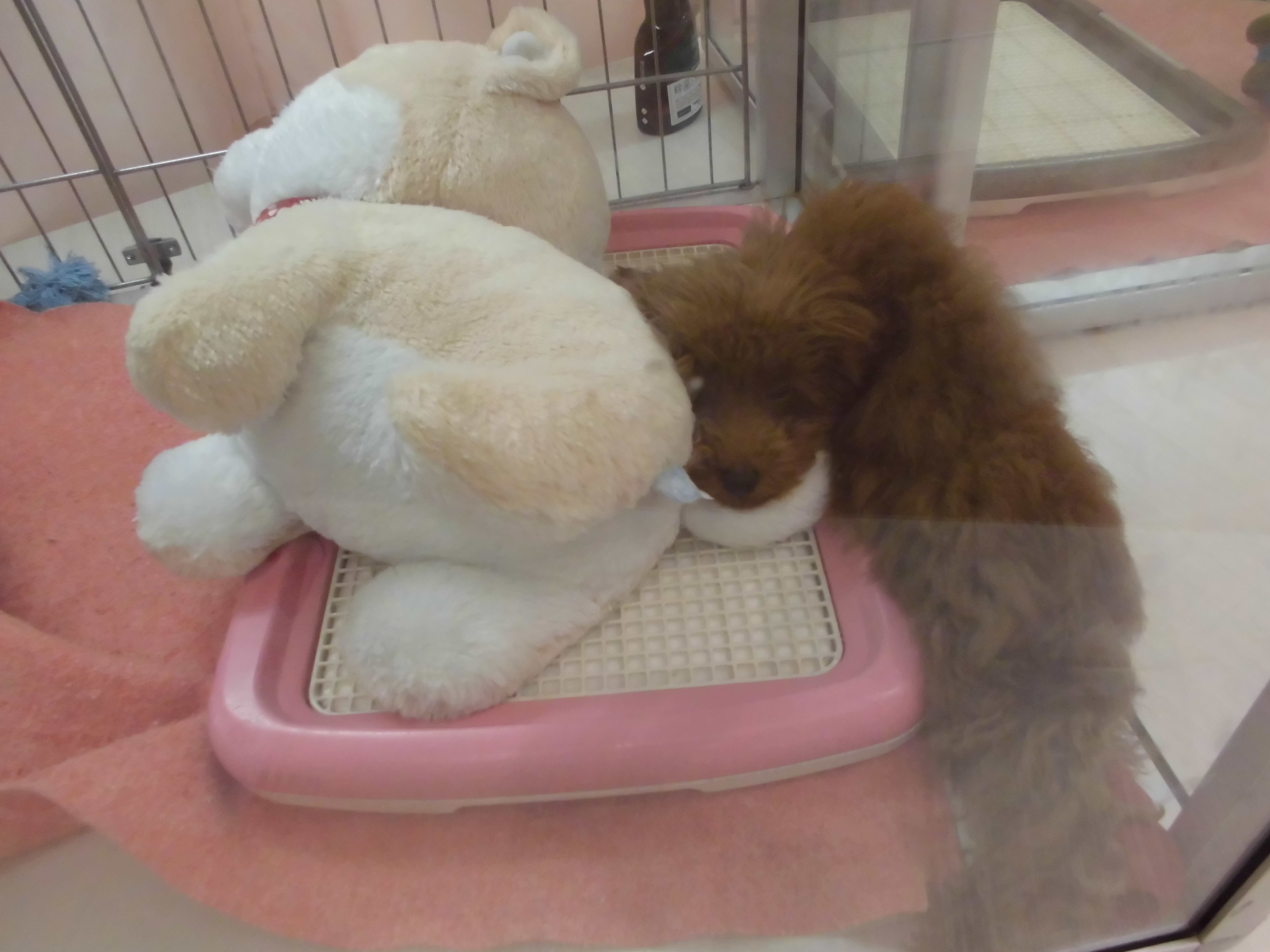 ぬいぐるみのしっぽに顎をのせてお昼寝中